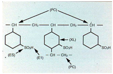 圖3、磺酸強(qiáng)酸陽離子樹脂(Amberlite lR-120),(XL)的化學(xué)結(jié)構(gòu)式:交X聯(lián);(PC):聚合物鏈;(ES):交換網(wǎng)站;(EI):可交換離子。